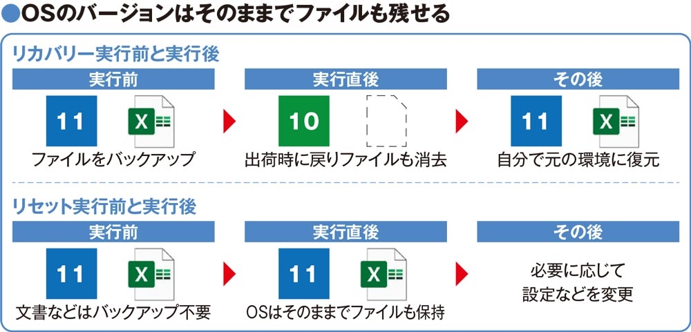 OSを初期化して快適な状態に戻せる点は共通しているが、リセットの場合は、工場出荷時のOSには戻らず、OSのバージョンはそのままで、各種設定が初期化されます。