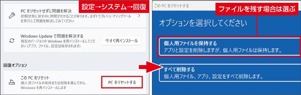 リセットでファイルを残す場合は、操作画面で「個人用ファイルを保持する」を選びます。