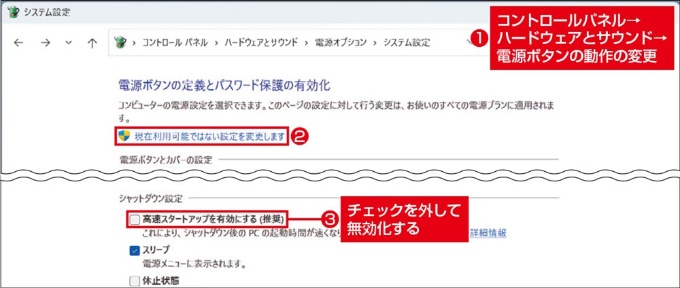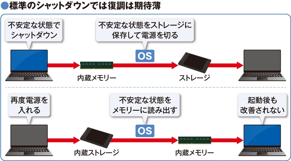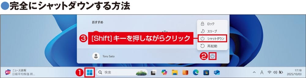 OS パソコンが不安定になったらシャットダウンで直る? 2026.01.14 2026.01.22 OSやアプリの動作が遅くなったり不安定になったりしたとき、「パソコンをシャットダウンして電源を入れ直せば、リフレッシュされた状態に戻せる」というのが従来の常識でした。 しかし、Windows 11のシャットダウンでは、その効果は必ずしも期待できません。 標準のシャットダウンが「高速スタートアップ」と呼ばれる方式であり、次回の起動後も不安定な状態を引き継ぐことがあるためです。 高速スタートアップは、「休止状態」の技術を応用した終了方法。 終了時にメモリー上のデータを内蔵ストレージへ保存してから電源を切る仕組みで、その目的は起動時間の短縮にあります。 とはいえ、従来のようにパソコンをリフレッシュさせる終了方法もあります。 それが[Shift]キーを押しながら「シャットダウン」ボタンをクリックすればOKです。また、「再起動」を実行しても同様の効果が得られるます。 逆に、毎回、完全にシャットダウンしたい場合は、高速スタートアップを無効化します。 「コントロールパネル」で「高速スタートアップを有効にする」のチェックを外すだけで設定できます。 ただし、無効にすると起動時間がやや長くなる可能性がある点には注意が必要です。 投稿者: MAC InterNetOS, Windows 電源ボタンを押して終了させると故障の原因になる? Windows 11 最新アップデートでOutloo...